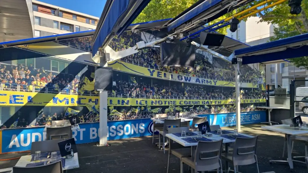 Il est midi trente à Clermont-Ferrand. Le soleil accroche le jaune des maillots, le bleu des écharpes, et un gamin tente de jongler avec un ballon taille 3 sous le regard amusé de son grand-père. À l’intérieur, le brouhaha est déjà une première mêlée : verres qui s’entrechoquent, serveurs en sprint, rires gras et effluves de bières ambrées. « La brasserie The Oval ne sert pas ici qu’à boire ou manger. C’est une seconde mi-temps, un vestiaire élargi, une cathédrale pour les fidèles de l’ASM Clermont Auvergne », glisse Gérard Soustons, fidèle supporter de l’ASM.