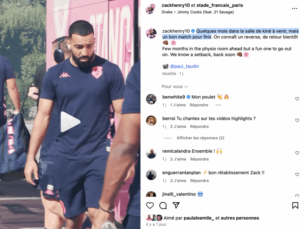 L’ancien joueur de Nevers est sorti touché lors de la dernière victoire des Parisiens à Perpignan en Top 14. « Quelques mois dans la salle de kiné à venir, mais un bon match pour finir. De retour bientôt« , a écrit Henry sur les réseaux sociaux.
