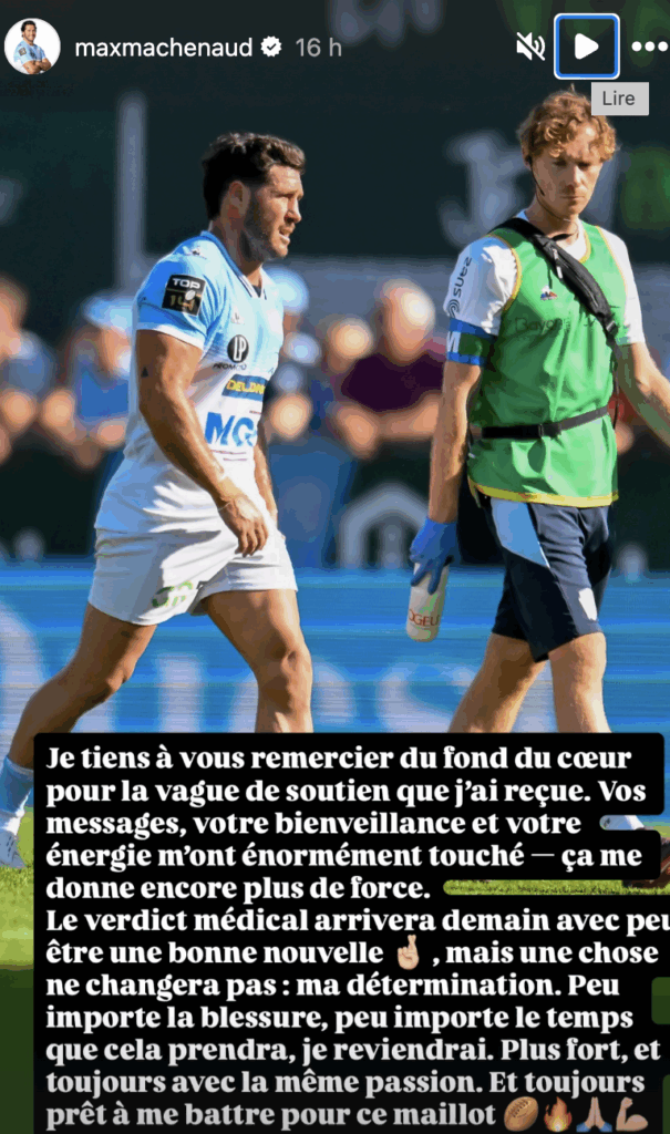 « Le verdict médical arrivera demain (ce mardi) avec peut-être une bonne nouvelle. Mais une chose ne changera pas : ma détermination. Peu importe ma blessure, peu importe le temps que cela prendra, je reviendrai. Plus fort et toujours avec la même passion« , a écrit Maxime Machenaud. Le natif de Bordeaux se dit « prêt » à se battre « pour ce maillot« .