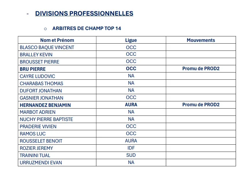 Pour deux d’entre eux, ce sera en revanche l’année de la découverte de la première division française. Il s’agit du Gersois Pierre Bru (34 ans), affilié à la ligue Occitanie et de l’Auvergnat Benjamin Hernandez (37 ans), affilié à la ligue Auvergne – Rhône-Alpes. Promus, les deux hommes au sifflet exerçaient en Pro D2 la saison dernière.